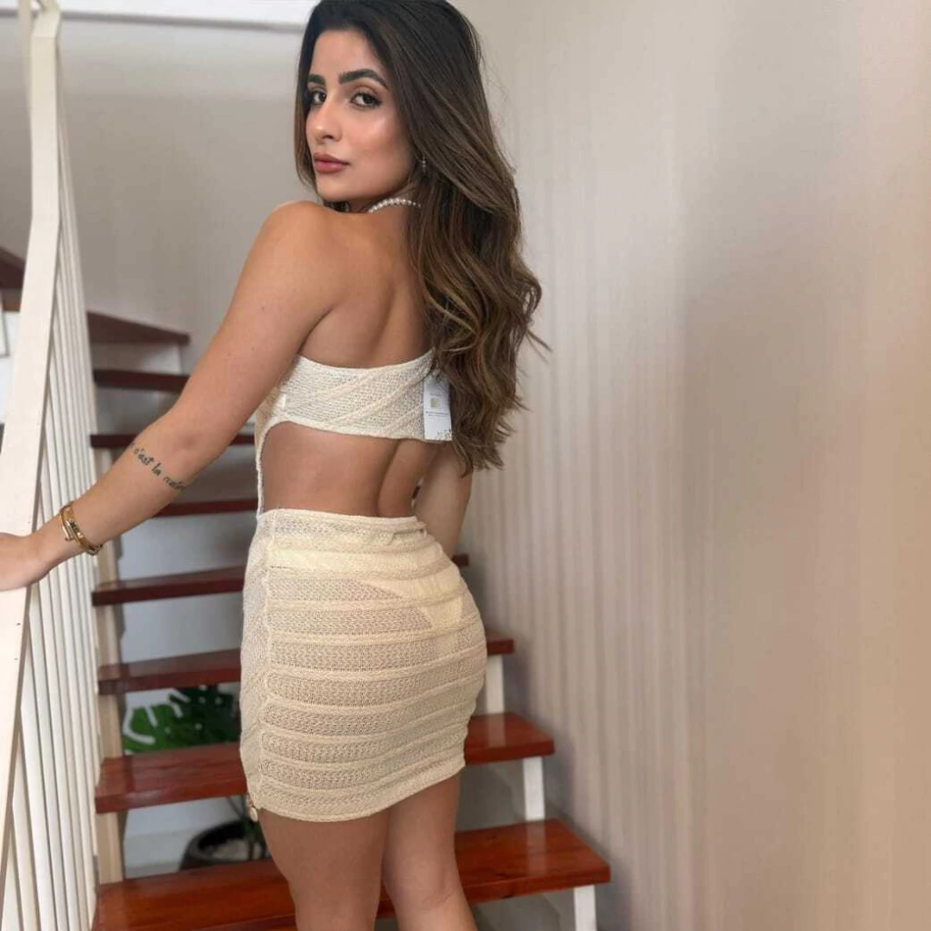 Um clássico reinventado com muito charme e frescor! O vestido branco curto com recortes laterais é a aposta perfeita para quem ama um visual elegante e moderno, sem abrir mão da leveza. O tecido texturizado realça as curvas com sutileza, enquanto o design assimétrico e os detalhes em conchas e pérolas trazem um toque de sofisticação praiana. Um modelo versátil que transita do almoço à beira-mar à noite especial com estilo e conforto.